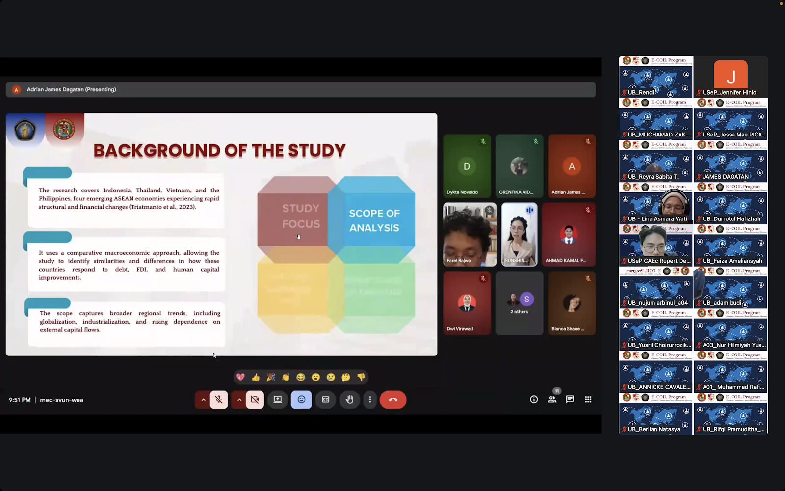 The meeting focused on a presentation by Group 8 on the effectiveness of ASEAN regional groupings, particularly ASEAN Plus 3 and ASEAN Plus 6, using a gravity model to analyze trade flows. The study found that ASEAN Plus 6 provided the strongest trade benefits, which was confirmed through sensitivity tests and robustness checks. The group recommended strengthening ASEAN Plus 6 cooperation and promoting deeper economic connections with North Asia. The conversation ended with testimonials from students about their experience in the collaborative program, expressing gratitude for the opportunity to learn and connect with students from Indonesia. Professor Lina expressed hope for future collaborations and mentioned processing an MOU for continued cooperation.